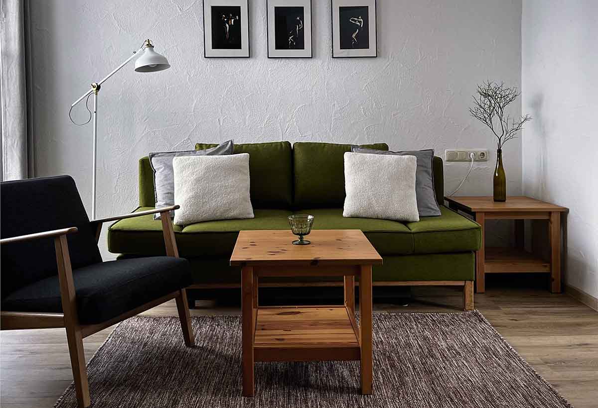 Der Wohnraum ist hell und modern gestaltet. Eine gemütliche Sitzecke mit Schlafcouch und Tisch lädt dazu ein, nach einem aktiven Tag auszuspannen und das TV-Programm zu genießen.