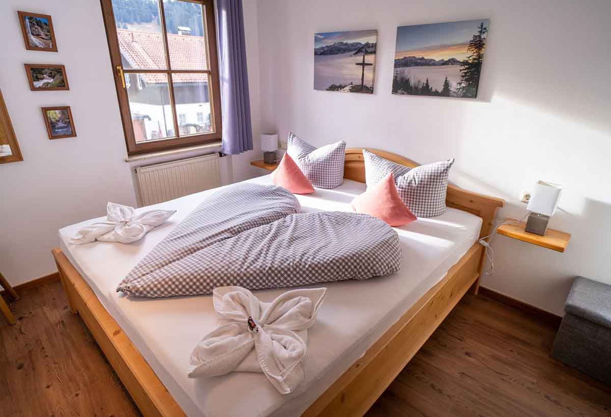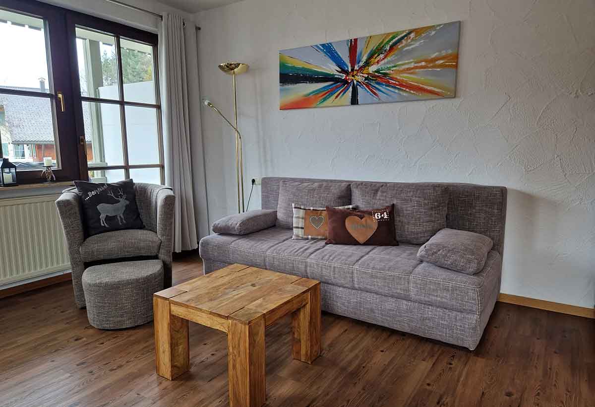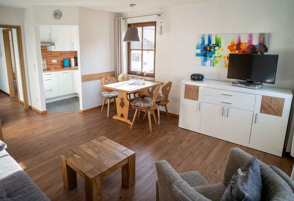 Die gemütliche Ferienwohnung Hirschbergtobel im Haus Allgäublick bietet Platz für 2 bis 4 Personen, eine moderne Ausstattung und einen schönen Balkon mit Blick in die Berge – ideal für erholsame Urlaubstage in Bad Hindelang.
