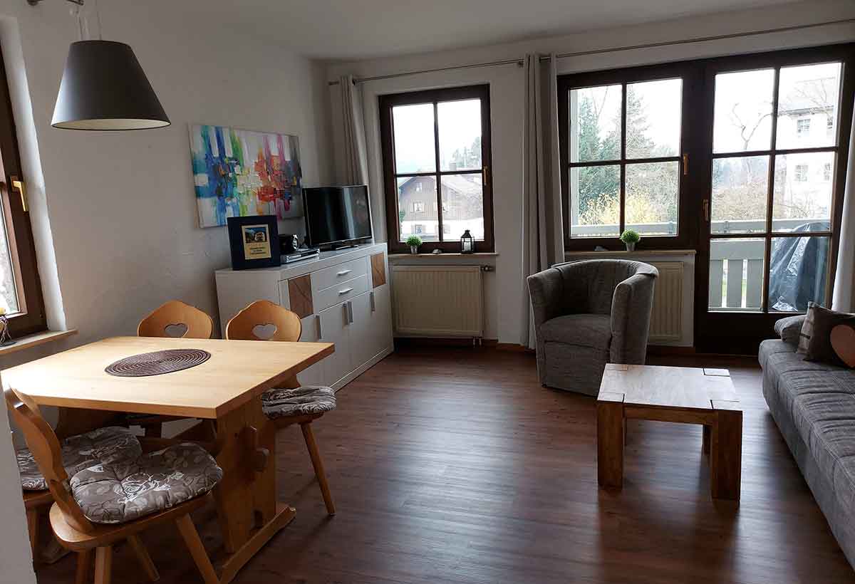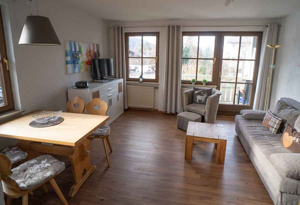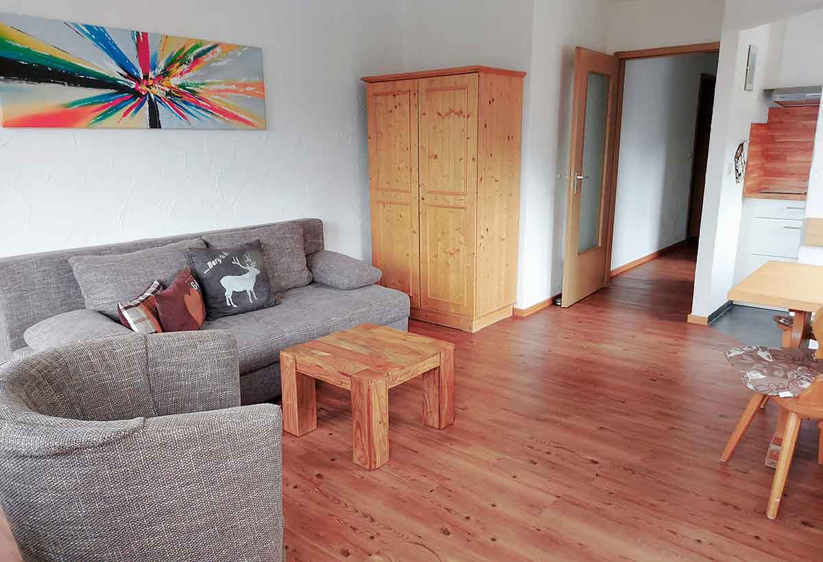 Der Wohnraum ist hell und freundlich eingerichtet. Hier finden Sie eine gemütliche Schlafcouch mit Tisch, auf der Sie entspannen und das TV-Programm genießen können. Vom Wohnbereich gelangen Sie direkt auf den schönen Balkon, von dem Sie eine fantastische Sicht in die Berge haben. Bei einem Glas Wein lassen Sie den Tag entspannt ausklingen.